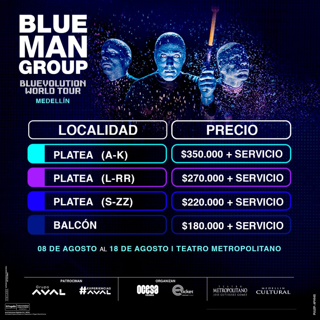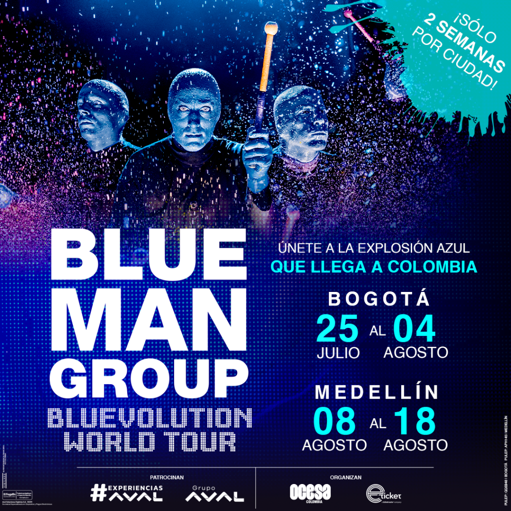 BLUE MAN GROUP el reconocido fenómeno teatral estará en Colombia por primera vez y ¡SOLO POR DOS SEMANAS POR CIUDAD! como parte de su extraordinaria gira mundial Blue Man Group’s Bluevolution World Tour en la ciudad deBogotá a partir del 25 de julio al 4 de agosto en el Teatro Colsubsidio y en Medellín del 8 al 18 de agosto en el Teatro Metropolitano.