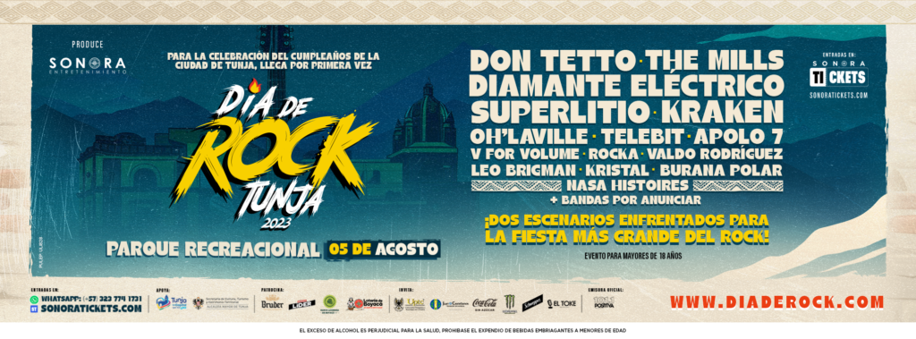 El próximo 5 de agosto se llevará a cabo la sexta edición del Día del Rock, por primera vez en la ciudad de Tunja en el Parque Recreacional para celebrar los 484 años de la cuna de la independencia. Esta es una de las fiestas más grandes del rock y contará con alrededor de 12 horas de música en vivo, 2 escenarios y más de 14 bandas, entre las que se encuentran Burana Polar, Don Tetto, The Mills, Diamante Eléctrico, Kraken, entre otros.