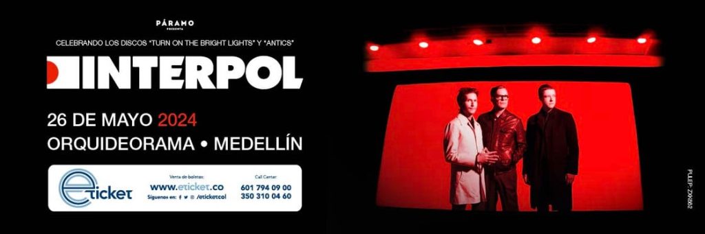 La banda que ha marcado un sonido fundamental en nuestra historia, Paul Banks, Daniel Kessler y Sam Fogarino, Interpol llega a Medellín en un única fecha en Colombia el próximo 26 de mayo de 2024 en el Orquideorama, en medio de la gira de aniversario de las dos mayores joyas de su discografía: Turn On The Bright Light (2002) y Antics (2004). La banda que marcó a una generación volverá al país para su primer concierto entre los árboles.