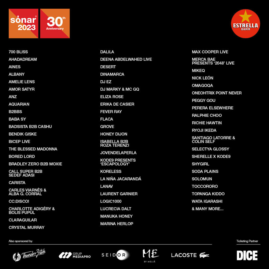 En este primer avance de line-up, se entrecruzan reconocidas figuras con una nueva hornada de artistas a la vanguardia, entre las que destacan Bicep, Fever Ray, Peggy Gou, Solomun, Oneohtrix Point Never, Amelie Lens, Honey Dijon, Laurent Garnier, Shygirl, Richie Hawtin, The Blessed Madonna, Max Cooper, Kode9, Logic1000, Erika de Casier, Ryoji Ikeda o Lucrecia Dalt, entre muchos otros.